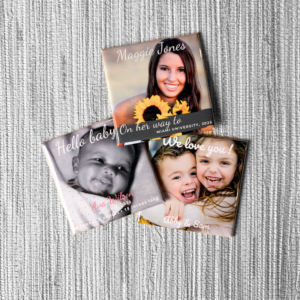 These are the magnets people order for a birth announcement, a graduation party favor, or a wedding save-the-date to send in a card. They are personal in a way that store-bought gifts cannot be. Small enough to mail. Meaningful enough to keep on the fridge for years. Ordering takes just minutes. Upload your photo, pick your template, fill in your text, and we handle everything else. We email you a proof once your magnets are designed, then ship your order promptly. Want magnets without text? See our set of nine square magnets — same handmade process, nine different photos.